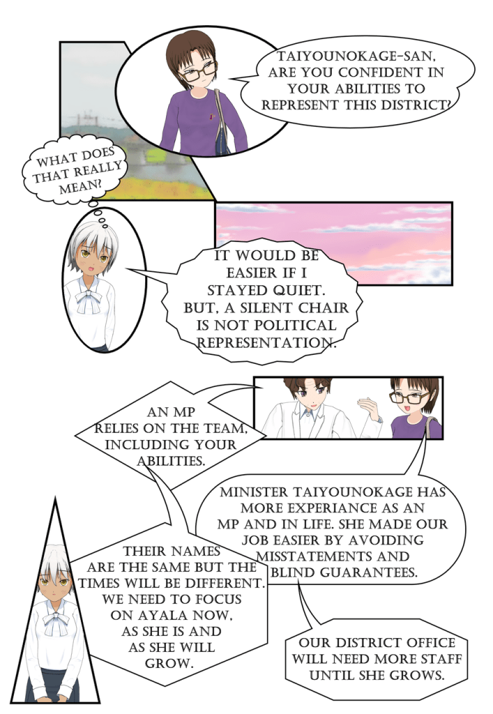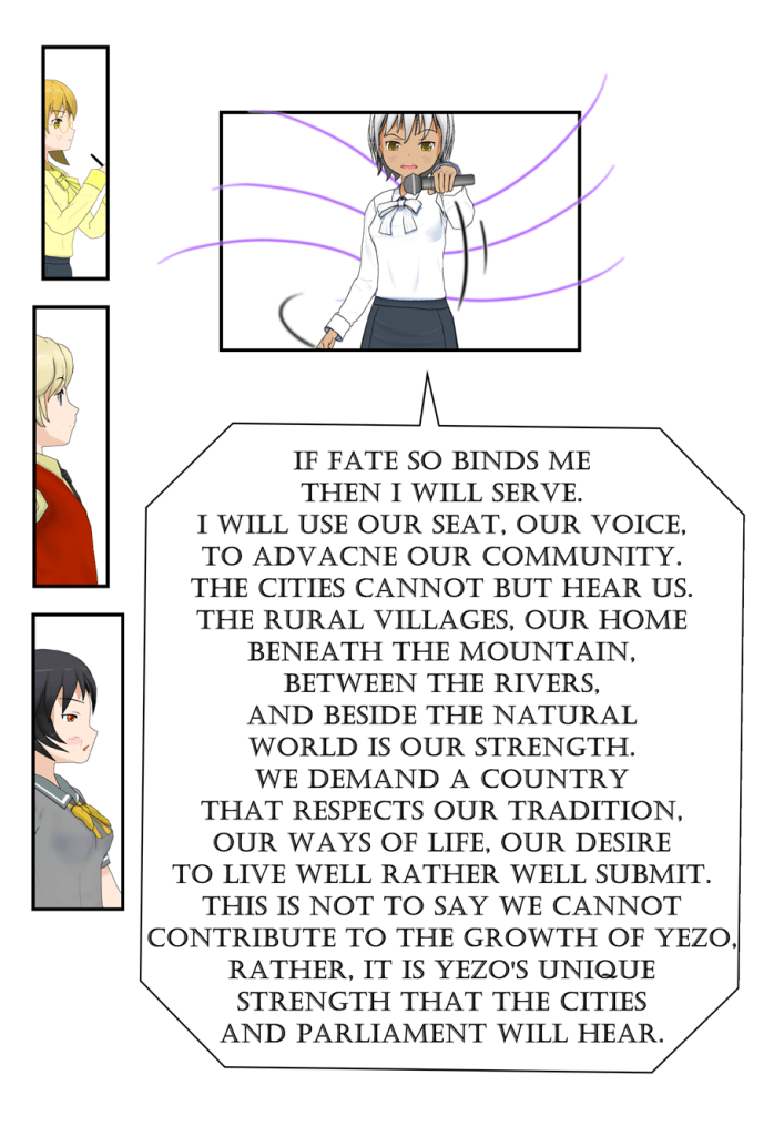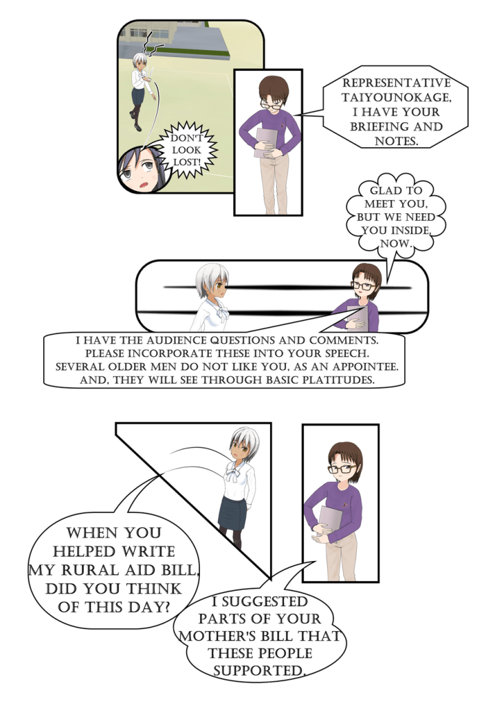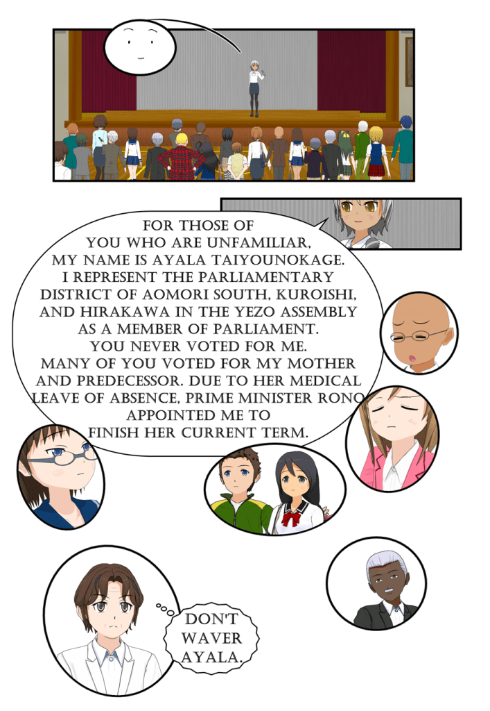Ready to step in front of her constituents for the first time, Representative Taiyounokage prepares to send a strong message. Will her appeals compel or entice support for her role in the Yezo National Assembly?
