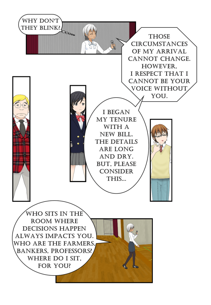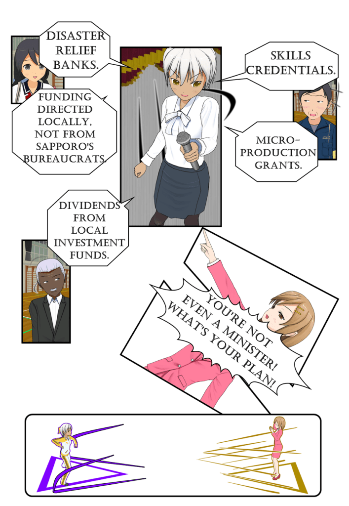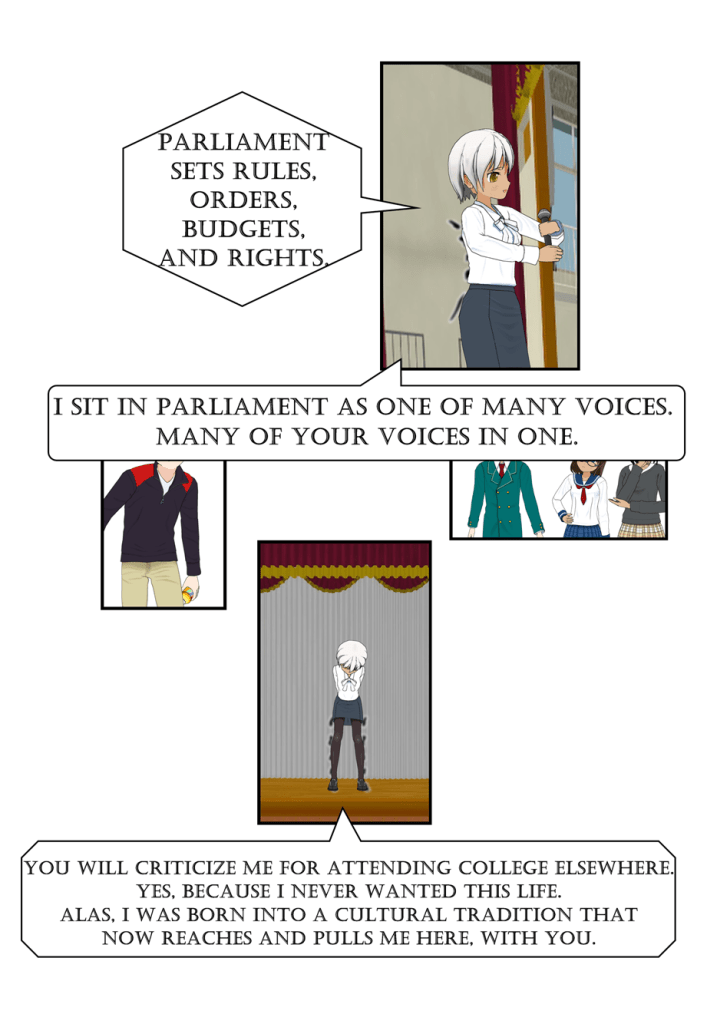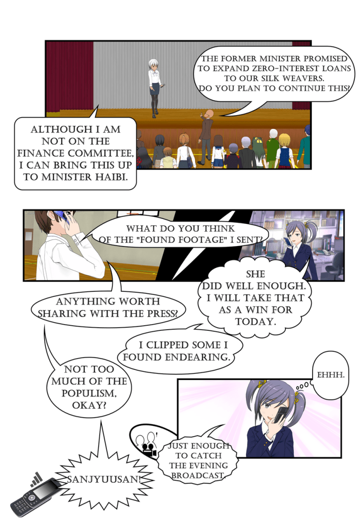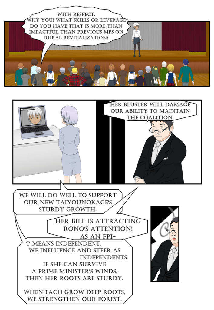 Ready to step in front of her constituents for the first time, Representative Taiyounokage prepares to send a strong message. Will her appeals compel or entice support for her role in the Yezo National Assembly?