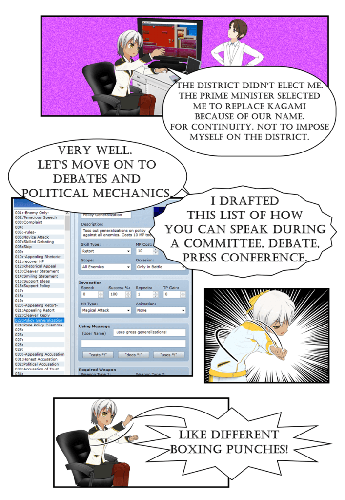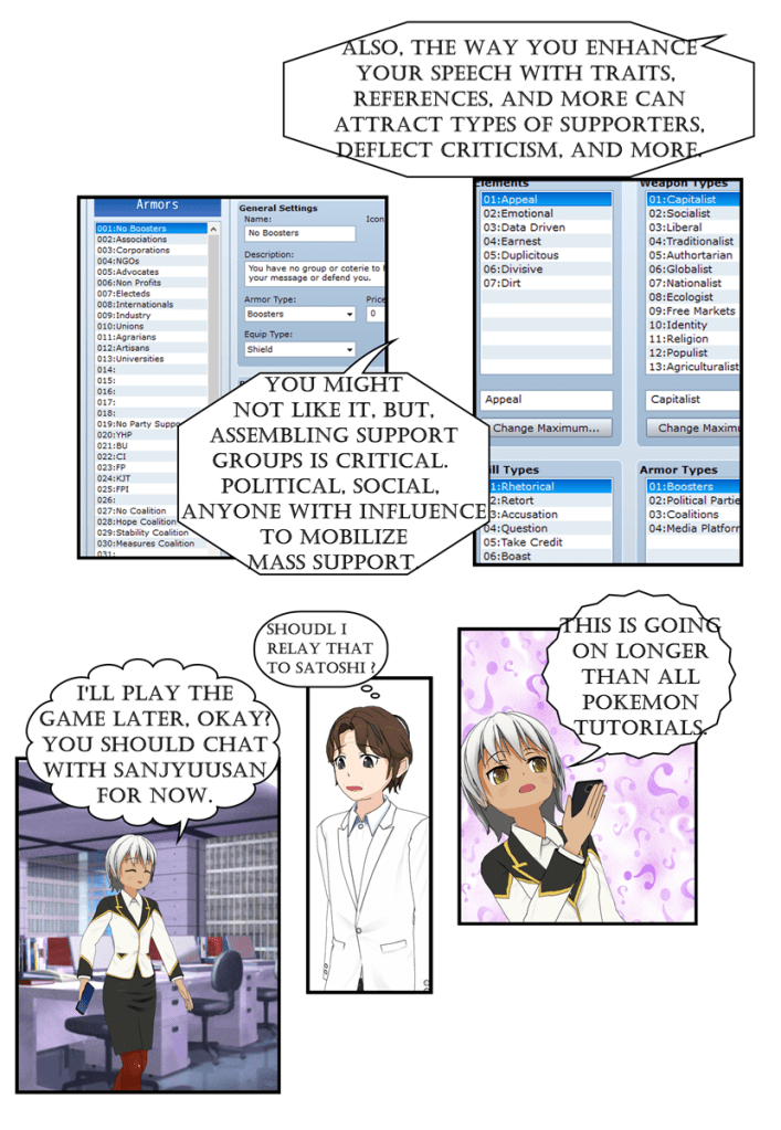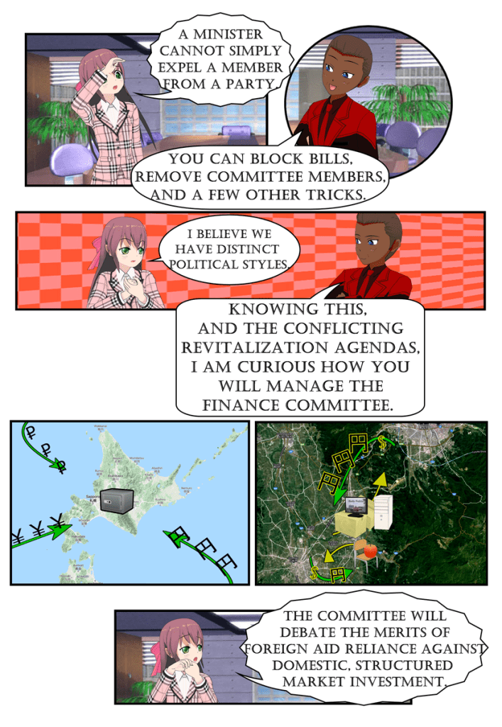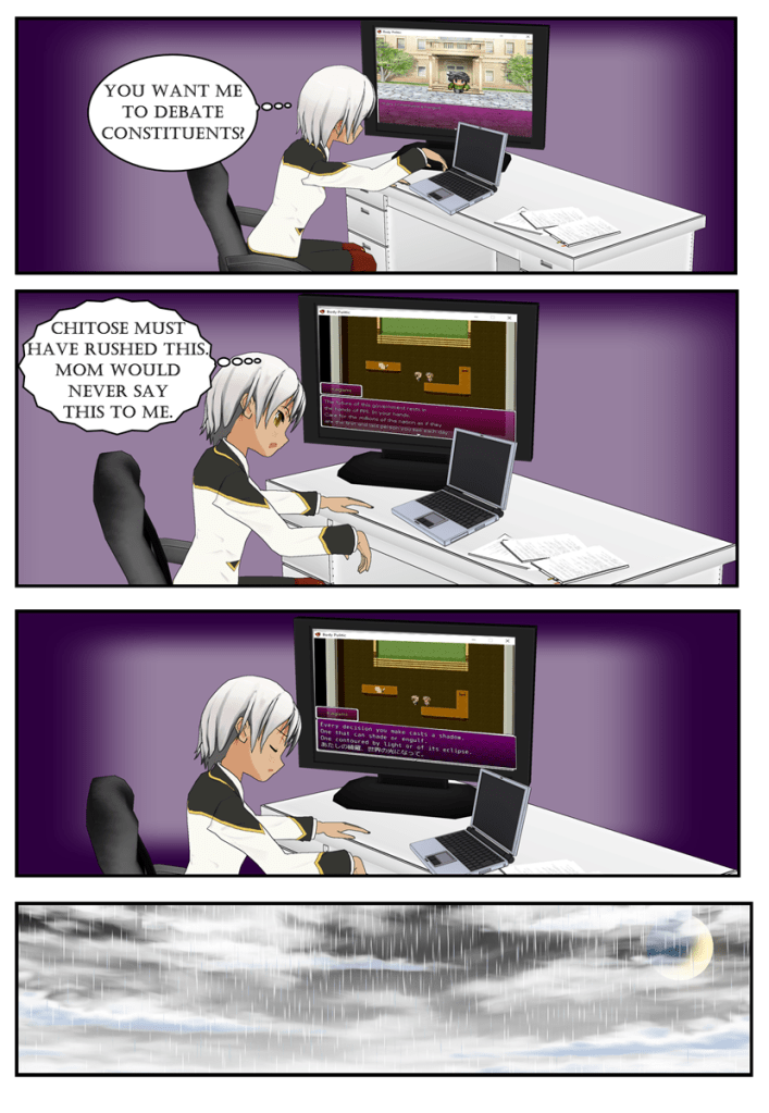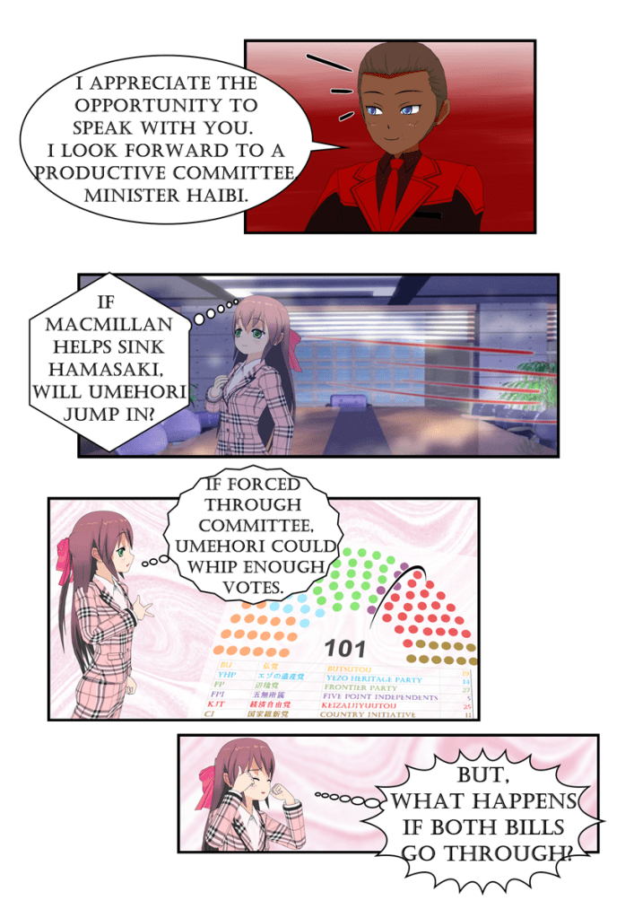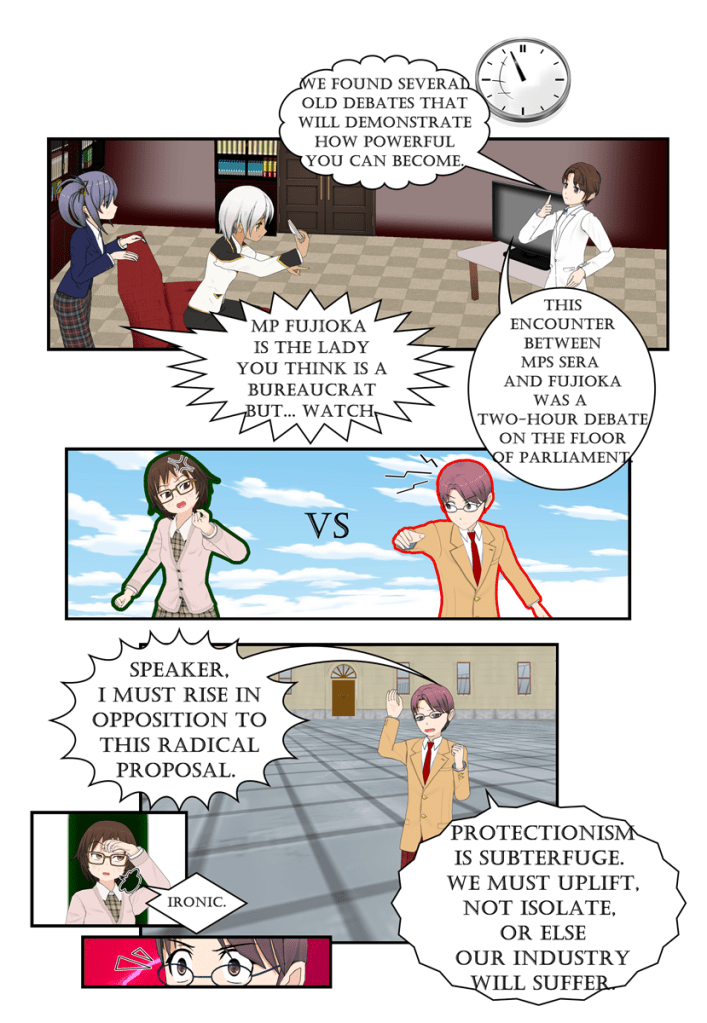 Chitosemaru steps up as chief advisor to teach Ayala various ways to debate and fight in the political arena. He brings out a video game to demonstrate what is going on including how support groups contribute to success in the arena. Sanjyuusan and Chitosemaru also bring out an old political debate to show Ayala how far she can improve.