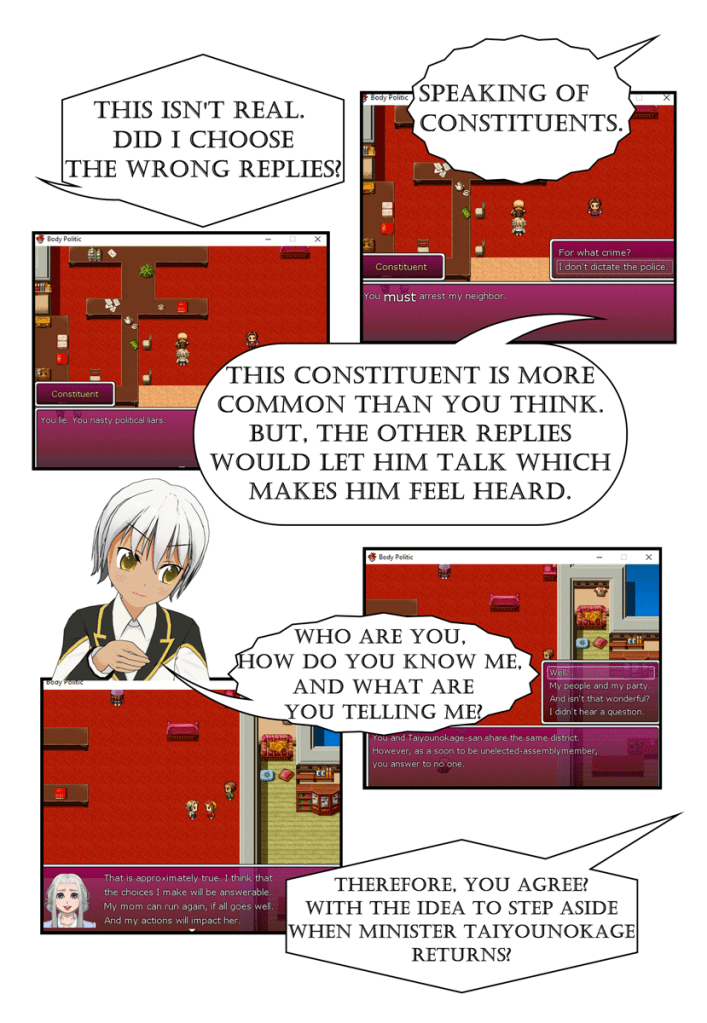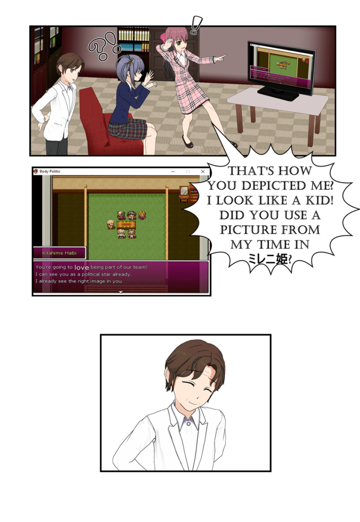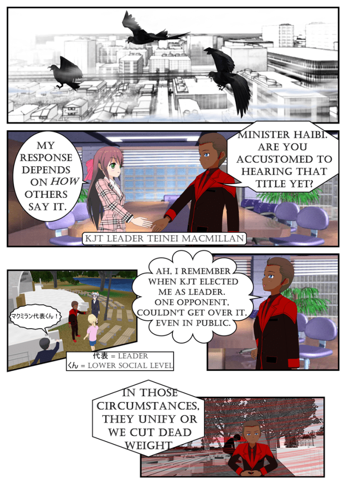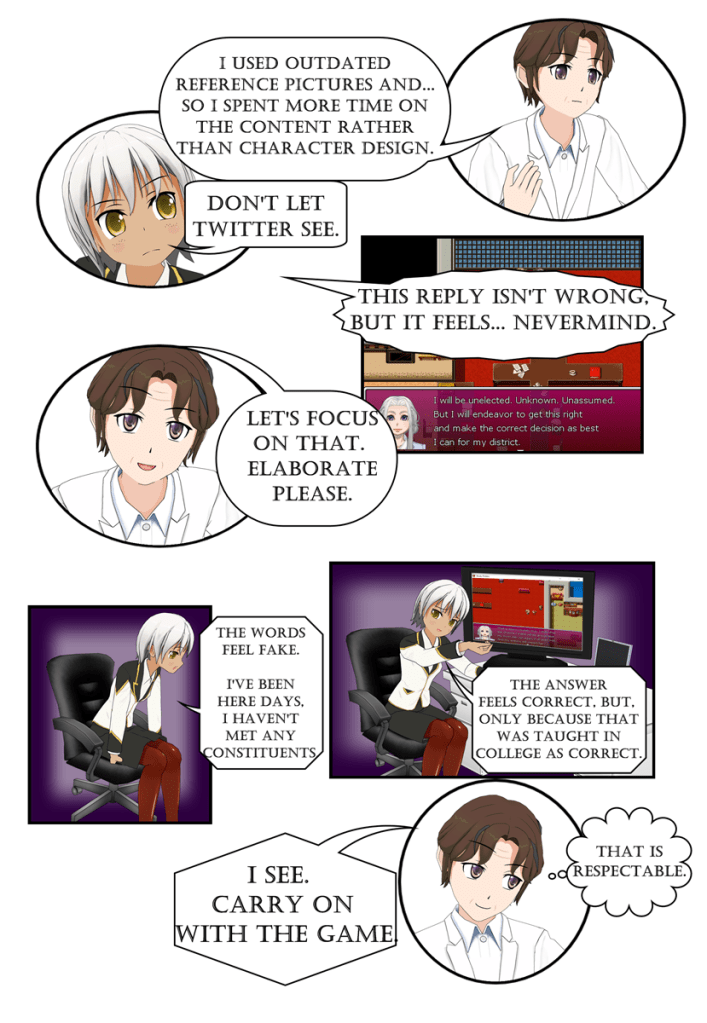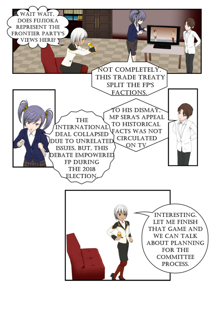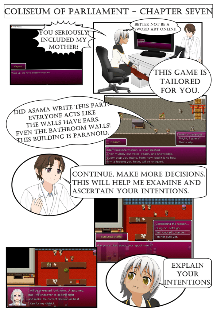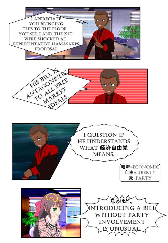 Chitosemaru steps up as chief advisor to teach Ayala various ways to debate and fight in the political arena. He brings out a video game to demonstrate what is going on including how support groups contribute to success in the arena. Sanjyuusan and Chitosemaru also bring out an old political debate to show Ayala how far she can improve.