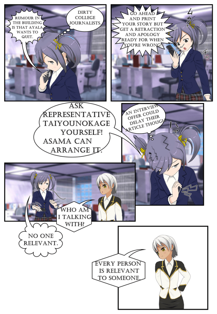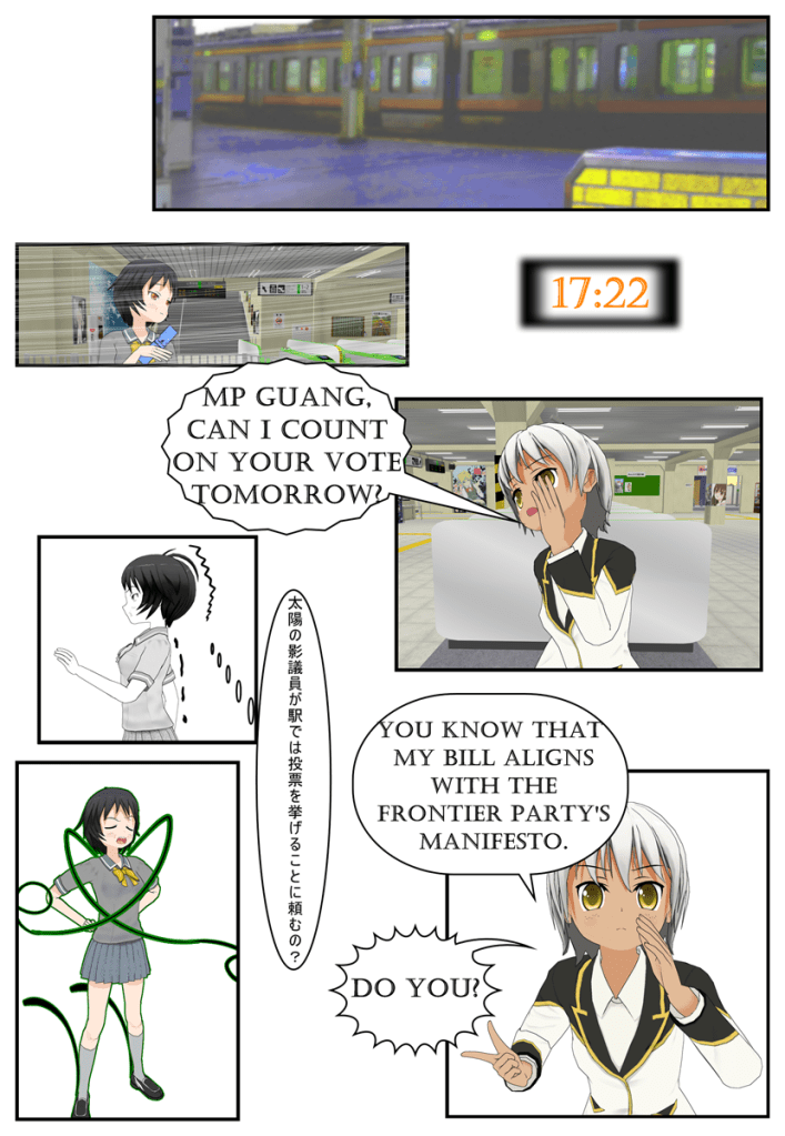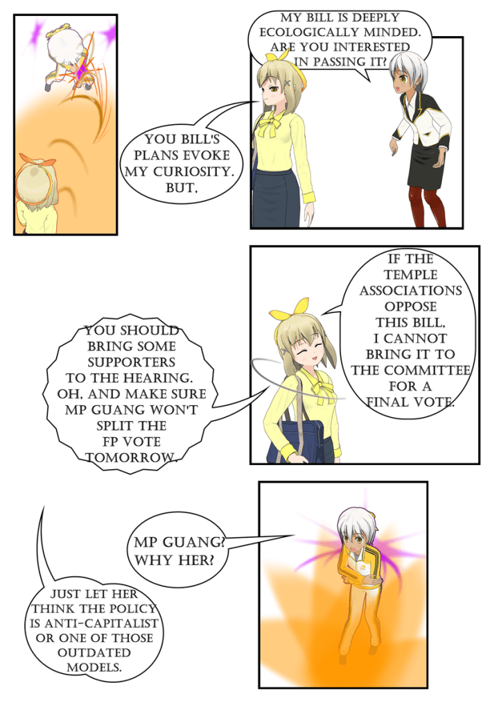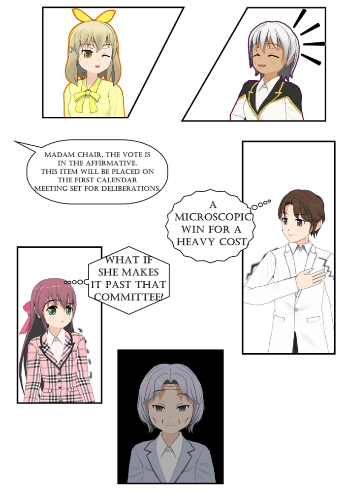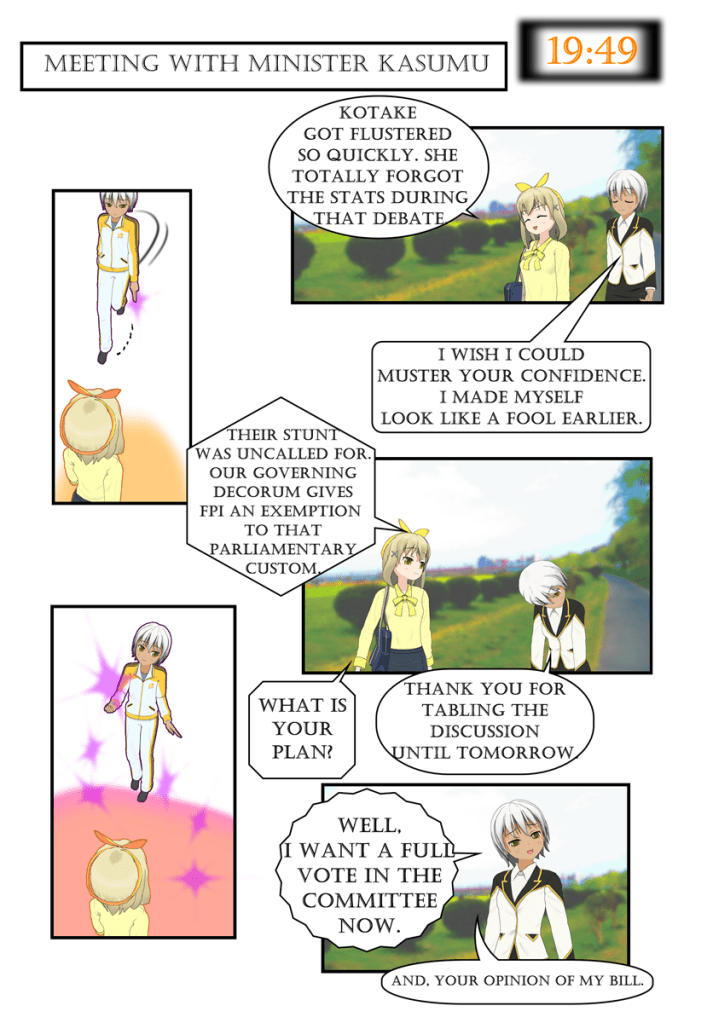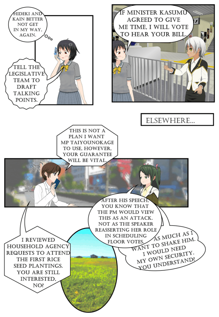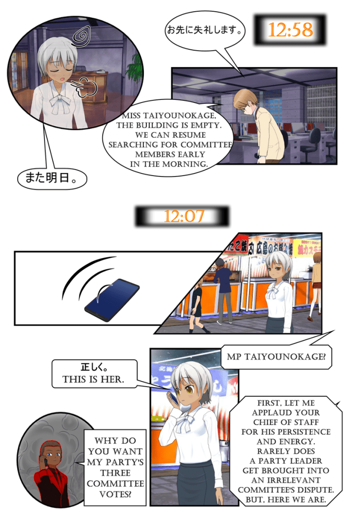 MP Taiyounokage has 24 hours to secure a lifeline for her rural revitalization bill in the Environmental Committee. To save her skin at the outset of her career will take a few unknowable sacrifices and deals.