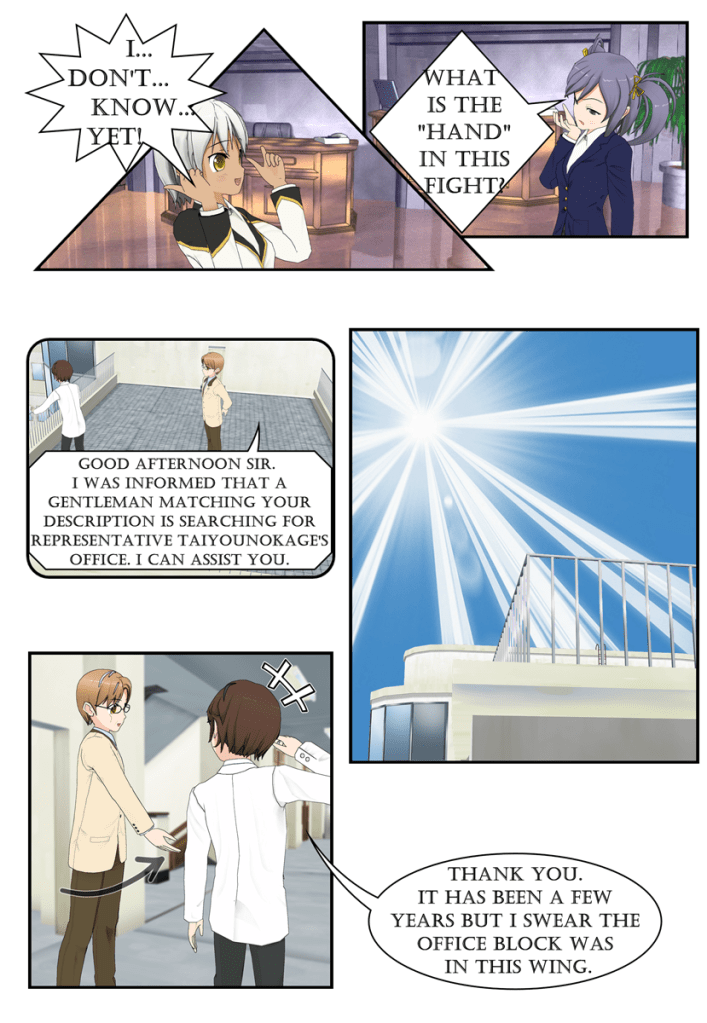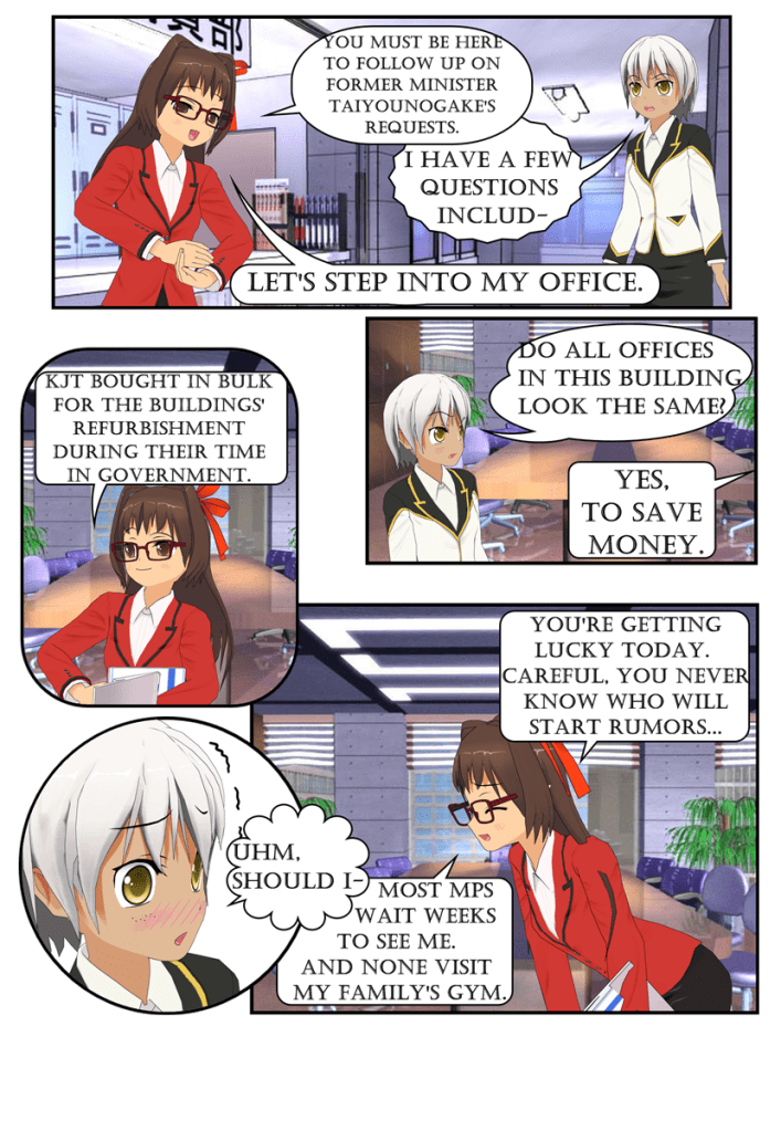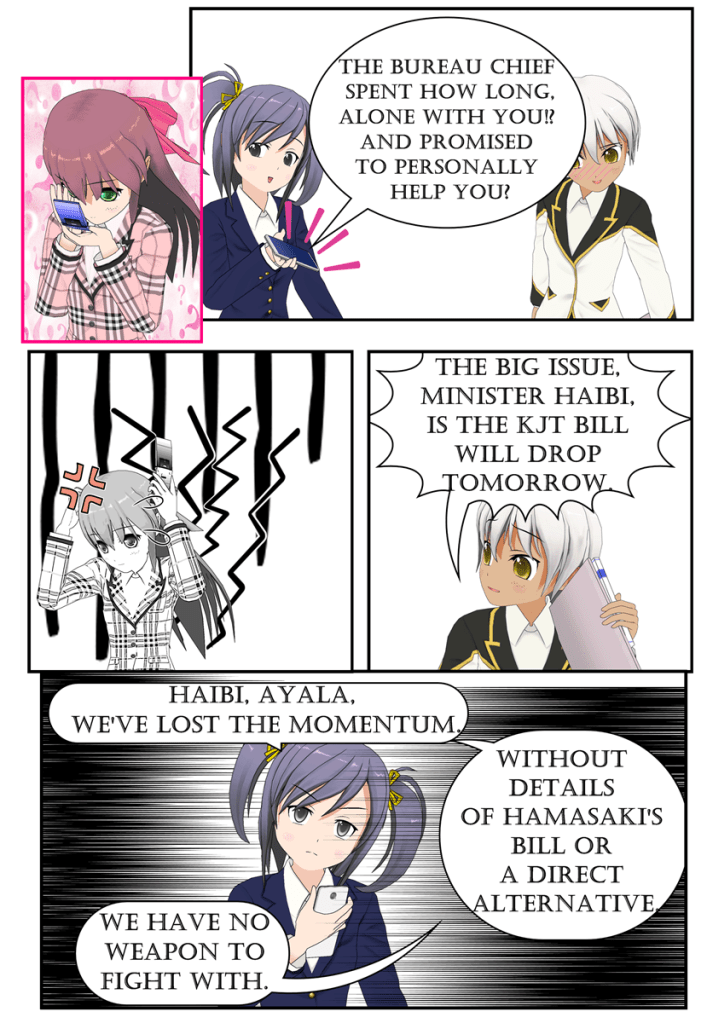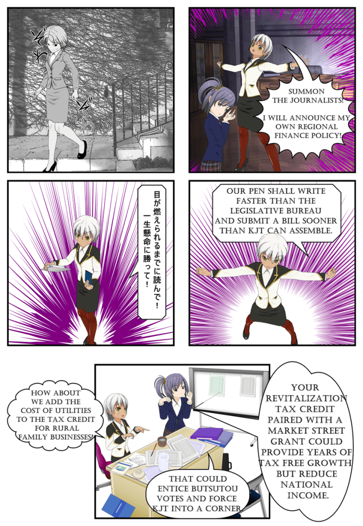 Ayala and Sanjyuusan bunker down to draft a bill to out-speed Representative Hamasaki’s regional revitalization plan that could damage Minister Haibi.