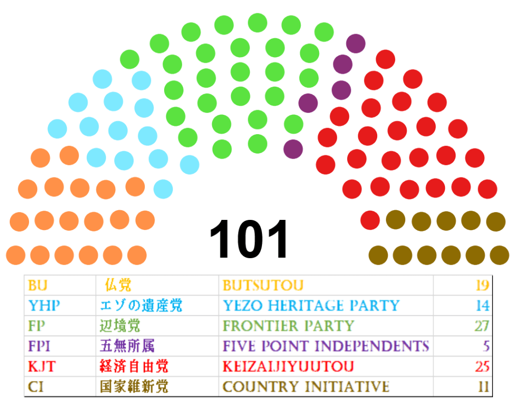The Parliament of Yezo is a unicameral multiparty body elected by direct elections with single-member and multi-member districts according to population size, distribution, and a quota system which mandates a minimum of 10 seats for candidates of Ainu heritage – this guarantee became the backbone of the Yezo Heritage Party. The quota system was implemented to address historical marginalization and ensure political representation during the ever-changing post-war era and occupation. Currently, in Coliseum of Parliament, six political parties sit in the chamber and four form a government comprised of 65 members from the YHP-FP-BU-FPI coalition.